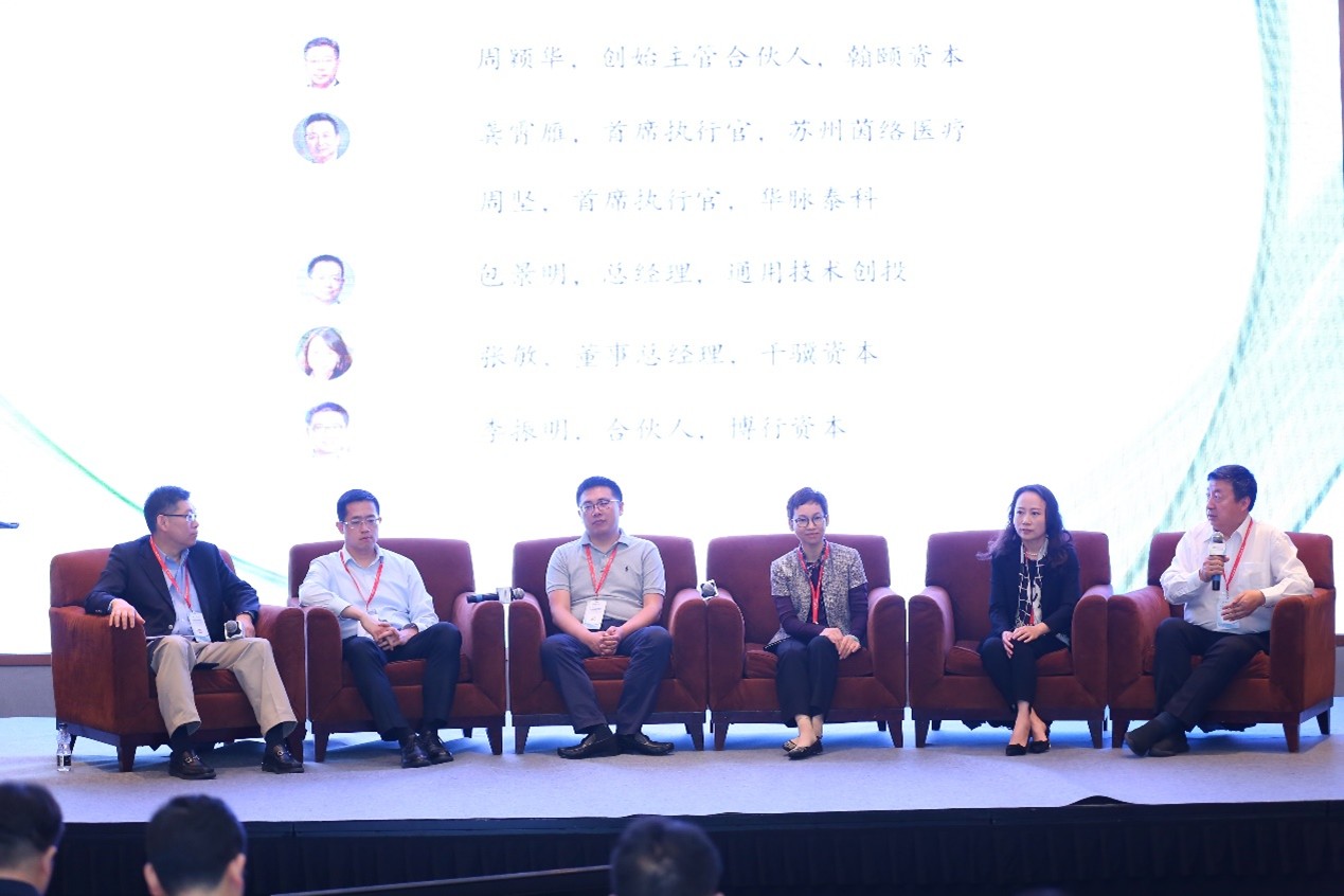 嘉宾讨论,从左到右,周颖华(翰颐资本)包景明(通用技术创投),李振明(博行资本),周坚(华脉泰科),张敏(千骥资本),龚霄雁(苏州茵络医疗)