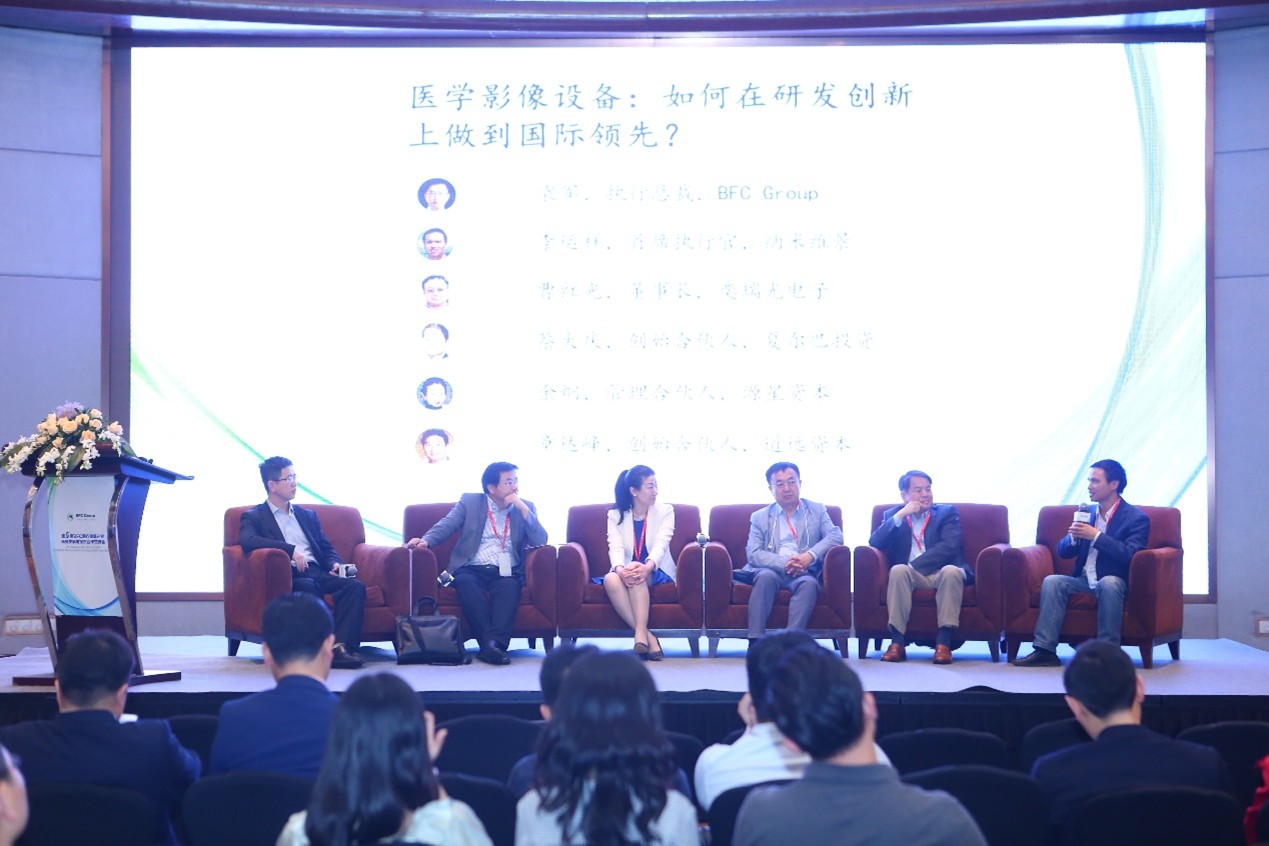 下午进行了5场嘉宾讨论。首先,围绕着“医学影像设备:如何在研发创新上做到国际领先?”影像行业的资深老兵——上海奕瑞光电子公司董事长曹红光回顾了国内影像行业二十年的发展,指出中国已经成为行业的世界第一大供应商,在很多领域里面已成为世界No.1。“下一步的目标主要是向高端突破,掌握核心部件,配合投资专家和好的基金,相信这样更好的土壤下可以成长起来非常优秀的公司。”推出新一代静态CT的纳米维景CEO李运祥“相信医疗器械领域的核心部件是异军突起的机会,不是风险……我们在医学影像高速成长,纳米维景要做到高清晰度、高速度,我们有一些永无止境的追求,并将永远追求下去”。夏尔巴投资创始合伙人蔡大庆非常赞同两位创业人的观点:“在影像这块,尤其在核心功能部件越来越国产化的大趋势里,投资人应该更创新一些,适当做一些不太一样的事情,承担一些风险来支持这个行业的进步。”已在医药、器械多个领域布局的道远资本创始合伙人章达峰对大影像一直给予非常大的关注,他表示“人才对中国医疗健康领域至关重要,医学影像行业随着人才的发展也会慢慢把市场抢占起来”。布局了两家影像龙头企业的源星金炯对影像投资有非常深刻的感受,认为“机遇与风险并存,很多原创、创新需要用投资人来支持整个产业链的建设”。