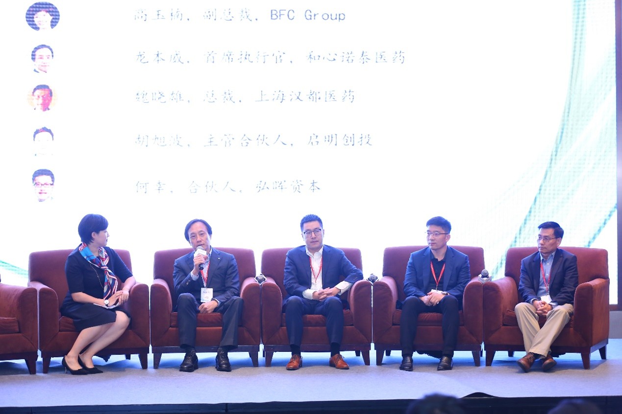 嘉宾讨论,从左到右,高玉楠(BFC Group),龙本威(和心诺泰医药),何幸(弘晖资本),胡旭波(启明创投),魏晓雄(上海汉都医药)