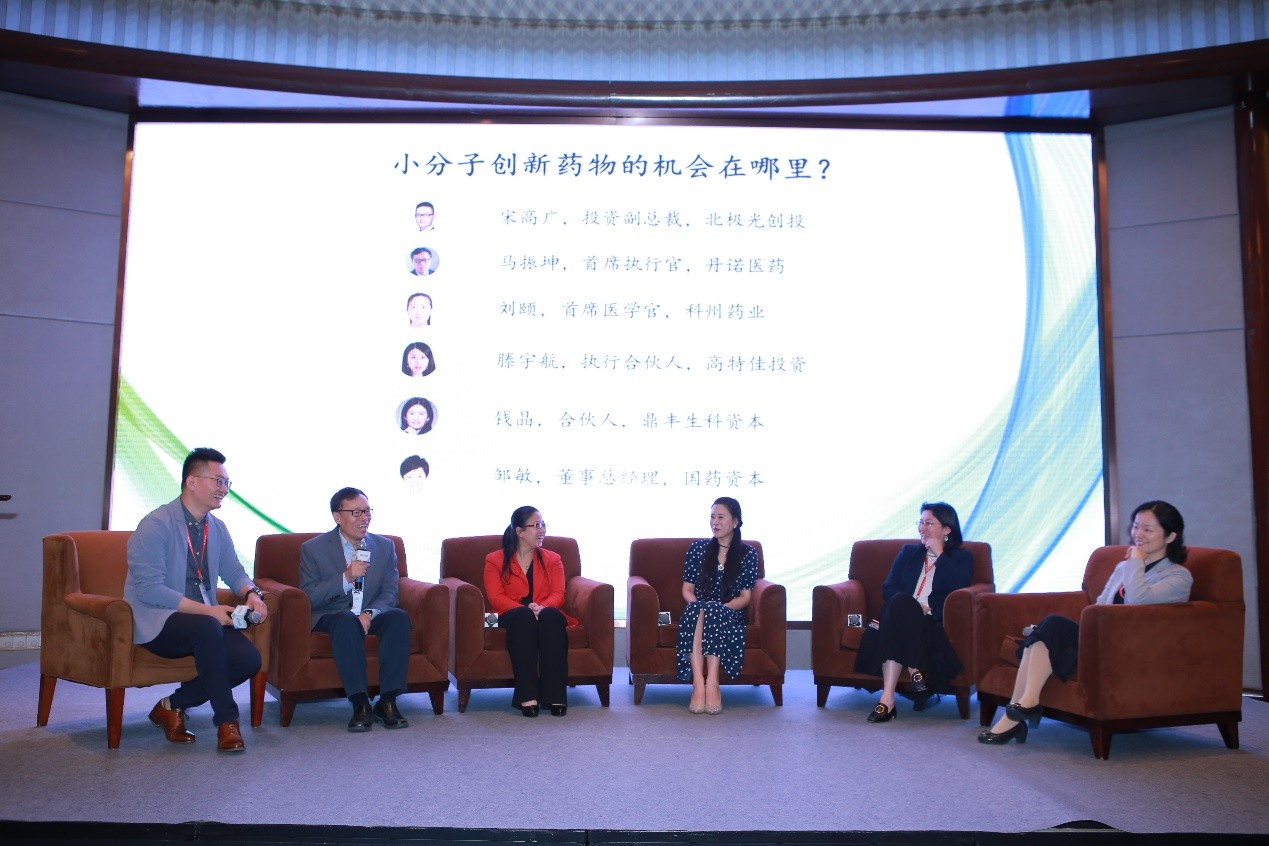 嘉宾讨论,从左到右,宋高广(北极光创投),马振坤(丹诺医药),刘颐(科州药业),滕宇航(高特佳投资),钱晶(鼎丰生科资本),邹敏(国药资本)